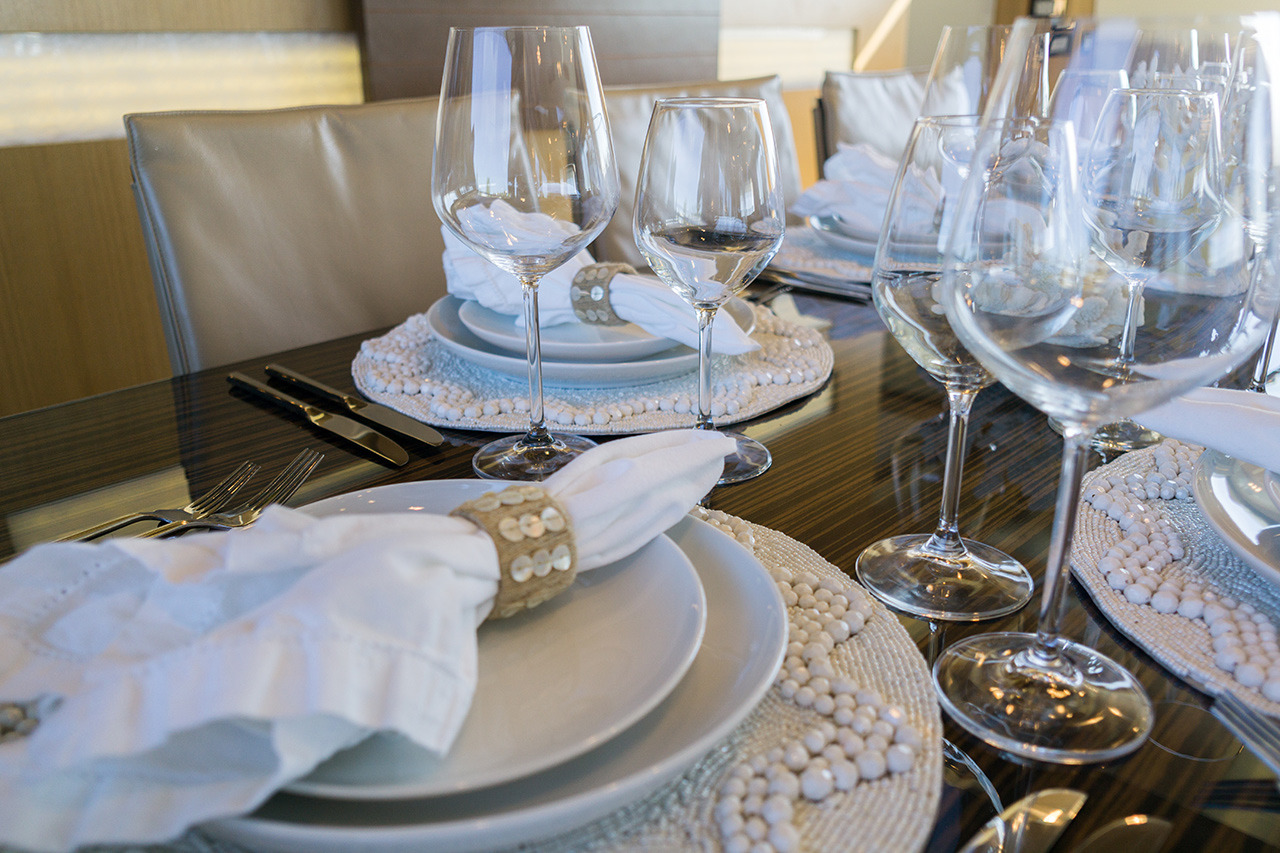 The yachts interiors are light and airy with a contemporary décor and refined neutral ambiance. Her main salon is laid in an open plan with a relaxing lounge aft and formal dining forward.