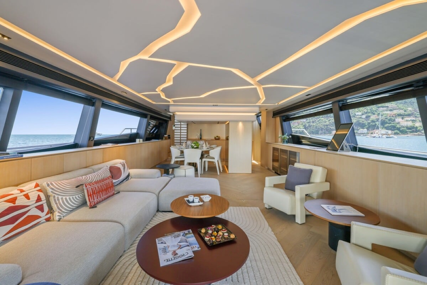 The open plan salon lounge and formal dining on the main deck is surrounded by panoramic windows, offering exceptional natural light and endless views. Apposing sofas, chairs and coffee tables make the lounge ideal for socializing, boasting a large TV forward.