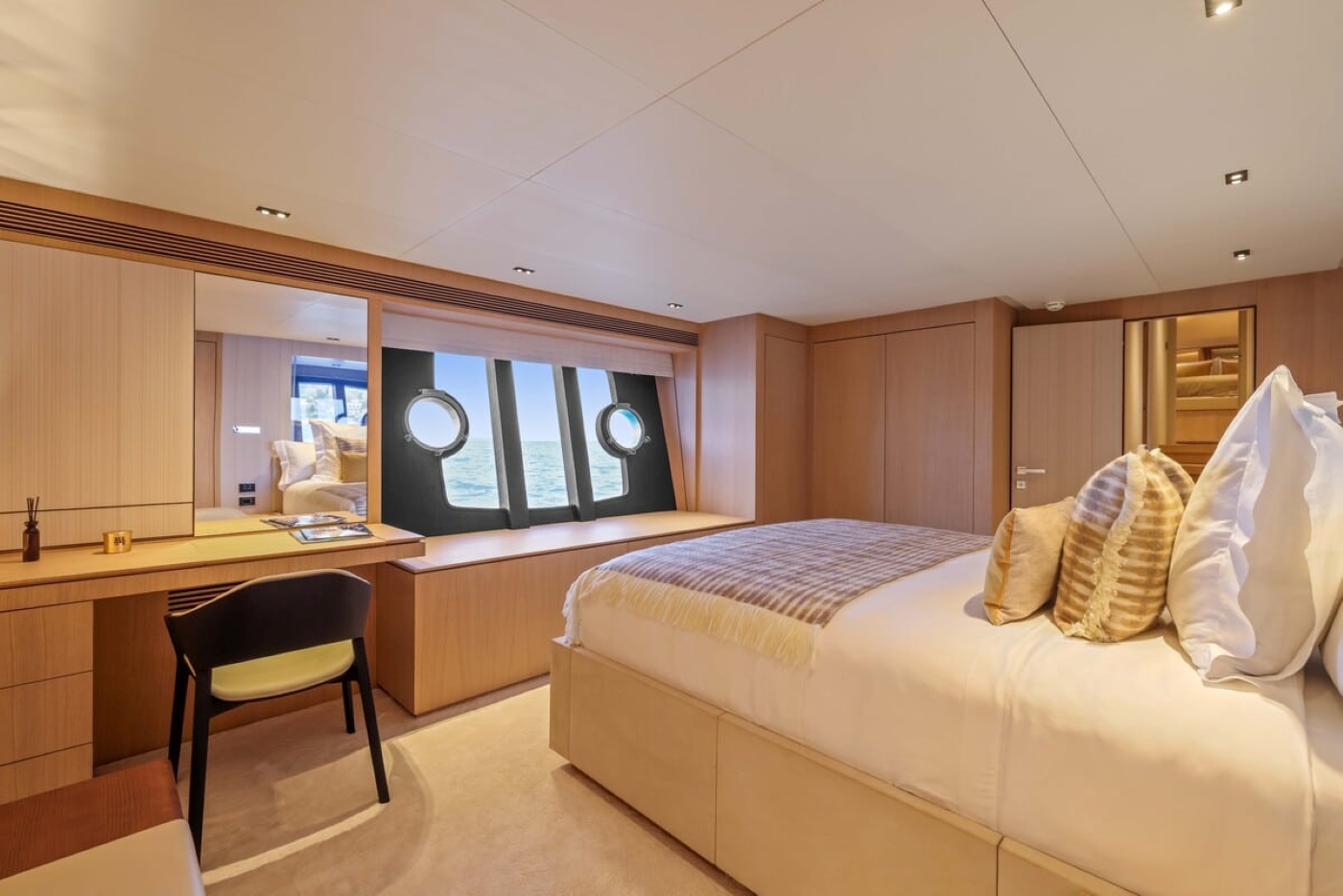 The master stateroom is amidships and full beam of the yacht, with a king size bed that faces a picturesque large in hull window, supplying spectacular views. The master cabin has a sofa, vanity and generous ensuite with a further large window, bath and shower. A VIP cabin is forward and full beam of the yacht, with a double bed.