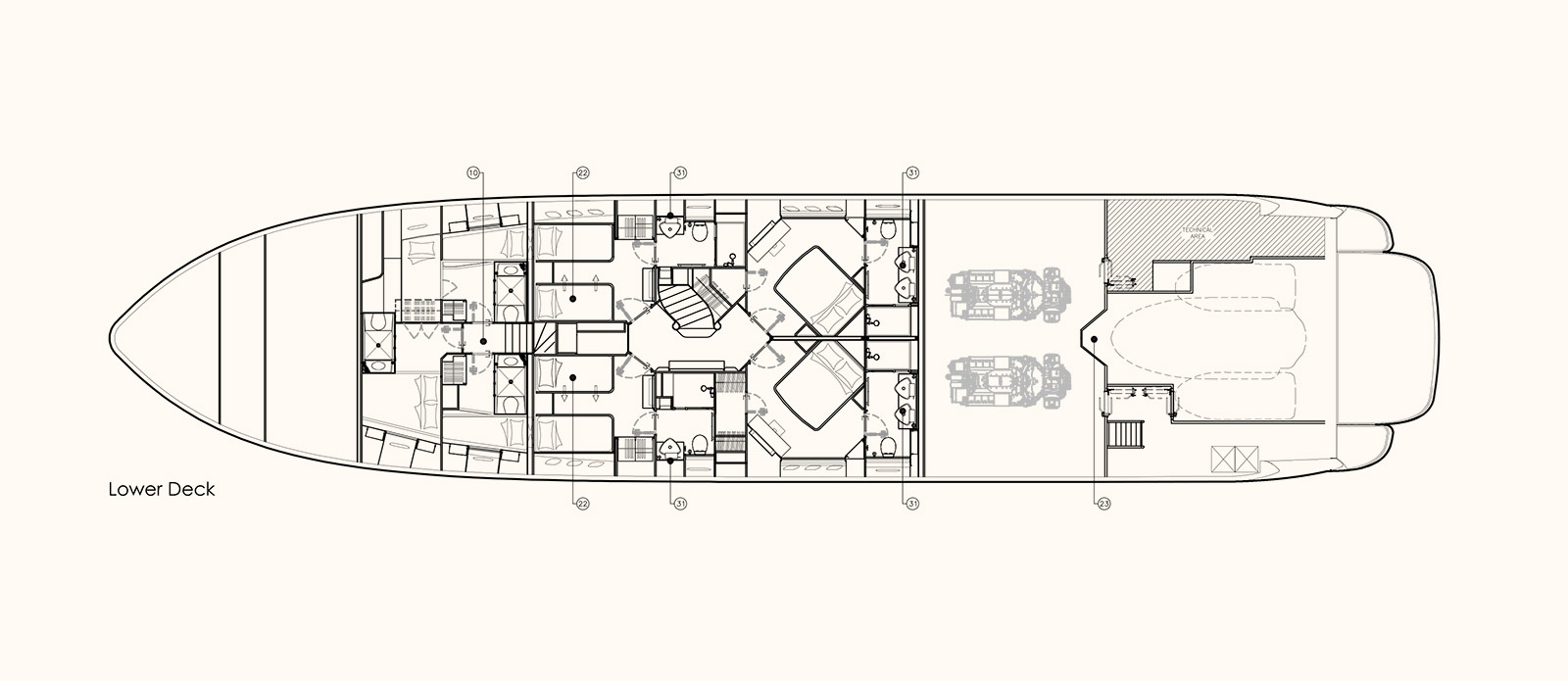 Steps descend to the swim platform, where guests can access the water with ease while using the water toys stored in the tender garage.