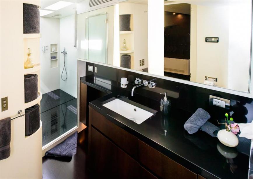 Upon entering the master cabin, there is a private study with seating on the starboard side, this leads into the full beam cabin space where there is a king size bed, sofa, desk, walk-in wardrobe and his and hers ensuite, offering a large central shower.