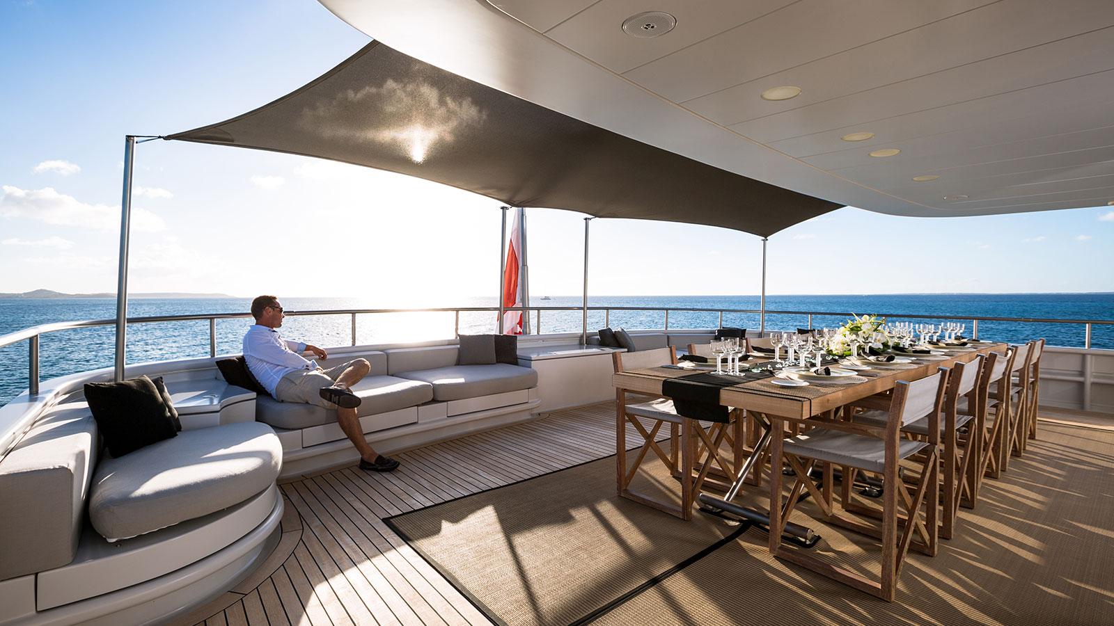 The main deck offers a comfortable salon and optional dining area, with a generous lounge, plush seating and coffee table.