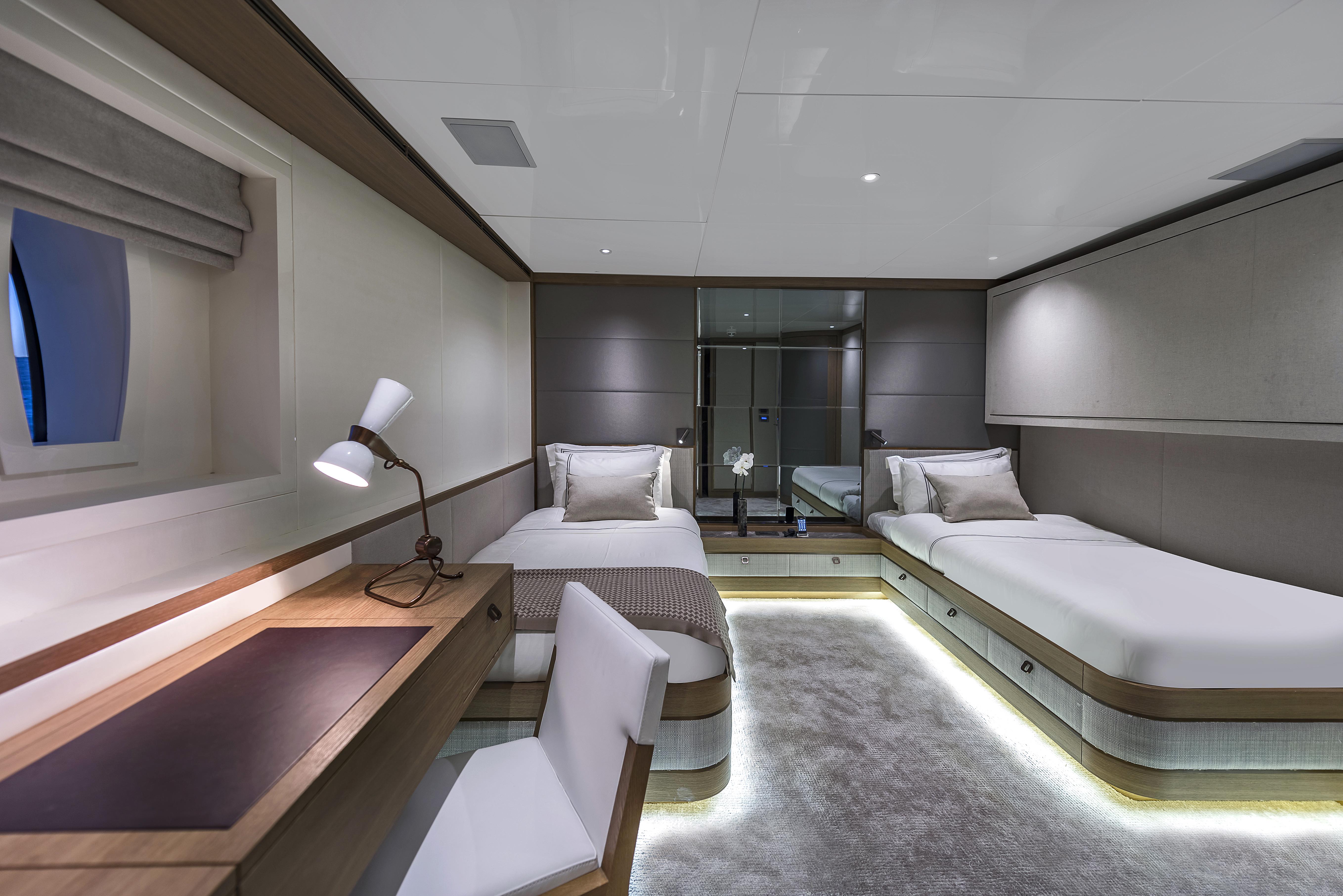 Her naval architecture is by CMB Yachts, while her interiors are the work of Arte-Bel Design Studio. She offers accommodation in 5 cabins, for up to 12 people. She was refitted in 2023/2024.