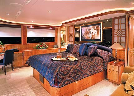 Sky Lounge: State-of-the-art entertainment center: 27" Flat Screen TV/DVD/CD. L-shaped sofa, Game table and full wet bar. Powder room forward. Access to Boat Deck.