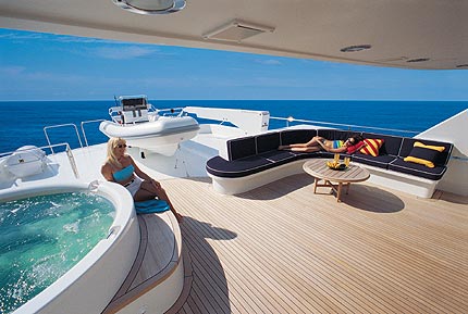 Luxury yacht VALHALLA provides accommodation for up to 10 charter guests in the following format: Master Stateroom, Main deck, forward: King bed, en-suite His and Her bath with Spa Pool tub and shower, 27" TV/VCR/DSS/CD Stereo.