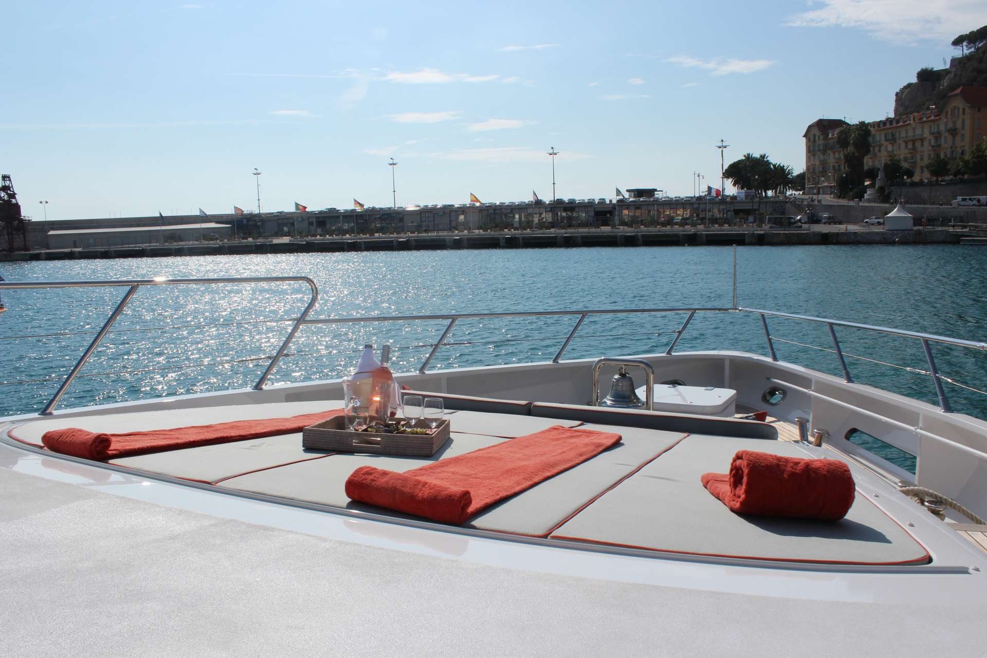 A stairways to starboard connects up to the flybridge, and side walkways lead around to the foredeck, where there is a curving loveseat for guests to sit and take in the views, or rest on the broad sunbed in front of the pilothouse.