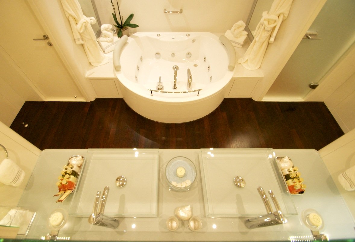 The Master en-suite bathroom boasts two sinks, a toilet and a Jacuzzi tub and separate shower.