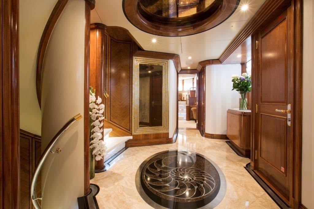 The flow from indoor to outdoor living and entertaining on the bridge deck is a seamless transition. A luxurious skylounge, elegantly decorated for casual entertaining with plush fabrics, raw silk panelled walls, sheer silk Roman blinds and matching American walnut cabinets featuring herring-bone inlays and ebonised walnut accents.