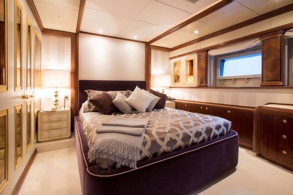 The main entry on the starboard side of ALASKA OF GEORGE TOWN's main deck opens into an impressive foyer with curved stairways to upper and lower decks. The foyer features silk panelled walls and American walnut timberwork with ebonised black inlay.