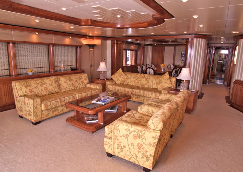 ALASKA OF GEORGE TOWN's main salon is rich in fine American walnut, Labrador granite and beautiful silk panelling. The theme is New York City penthouse. Gold leaf, black stepped cabinets provide storage.
