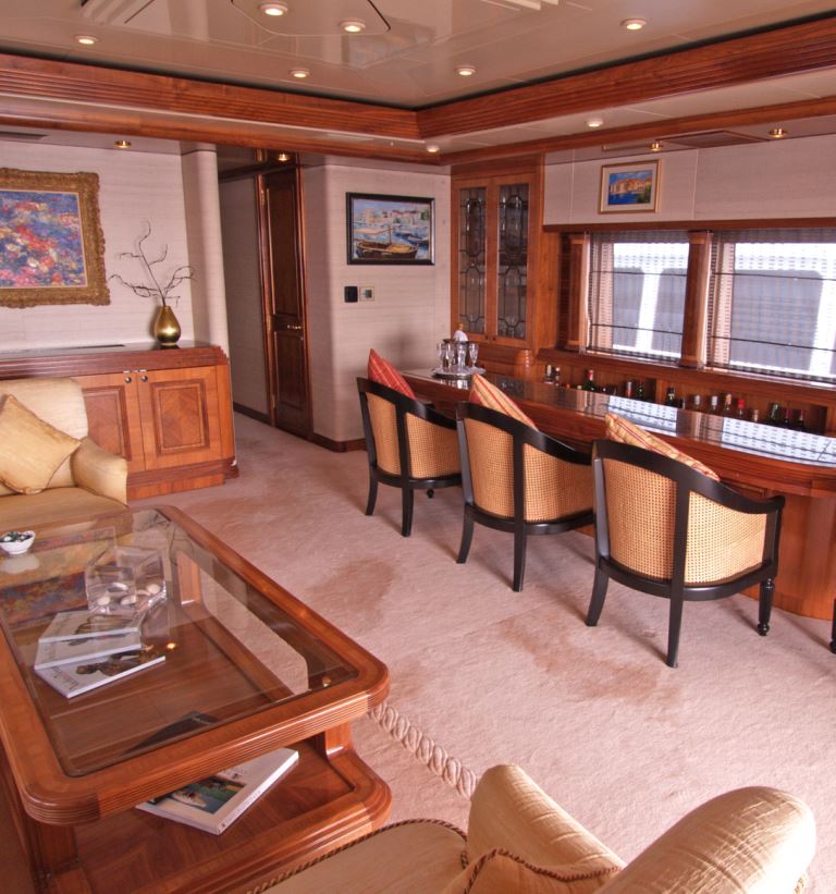 A luxurious skylounge, elegantly decorated for casual entertaining with plush fabrics, raw silk panelled walls, sheer silk Roman blinds and matching American walnut cabinets featuring herring-bone inlays and ebonised walnut accents. A 42” plasma screen pop-up TV and sunken bar are the finishing touches in this very social space.