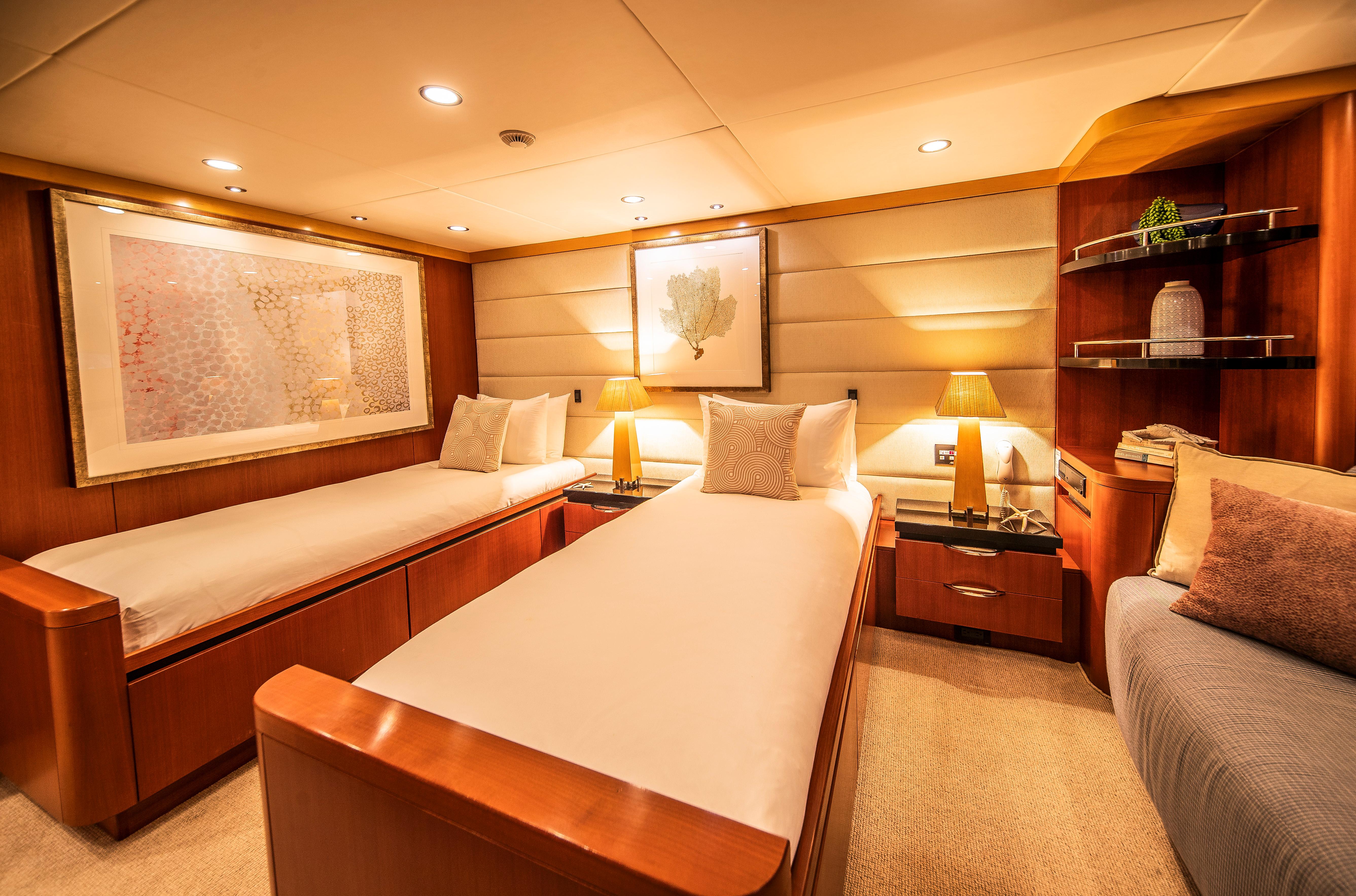 Above the main deck, is the pilothouse forward, followed by the luxurious full beam master cabin aft, with a double bed, private lounge, study, en-suite facilities and generous private deck with seating.