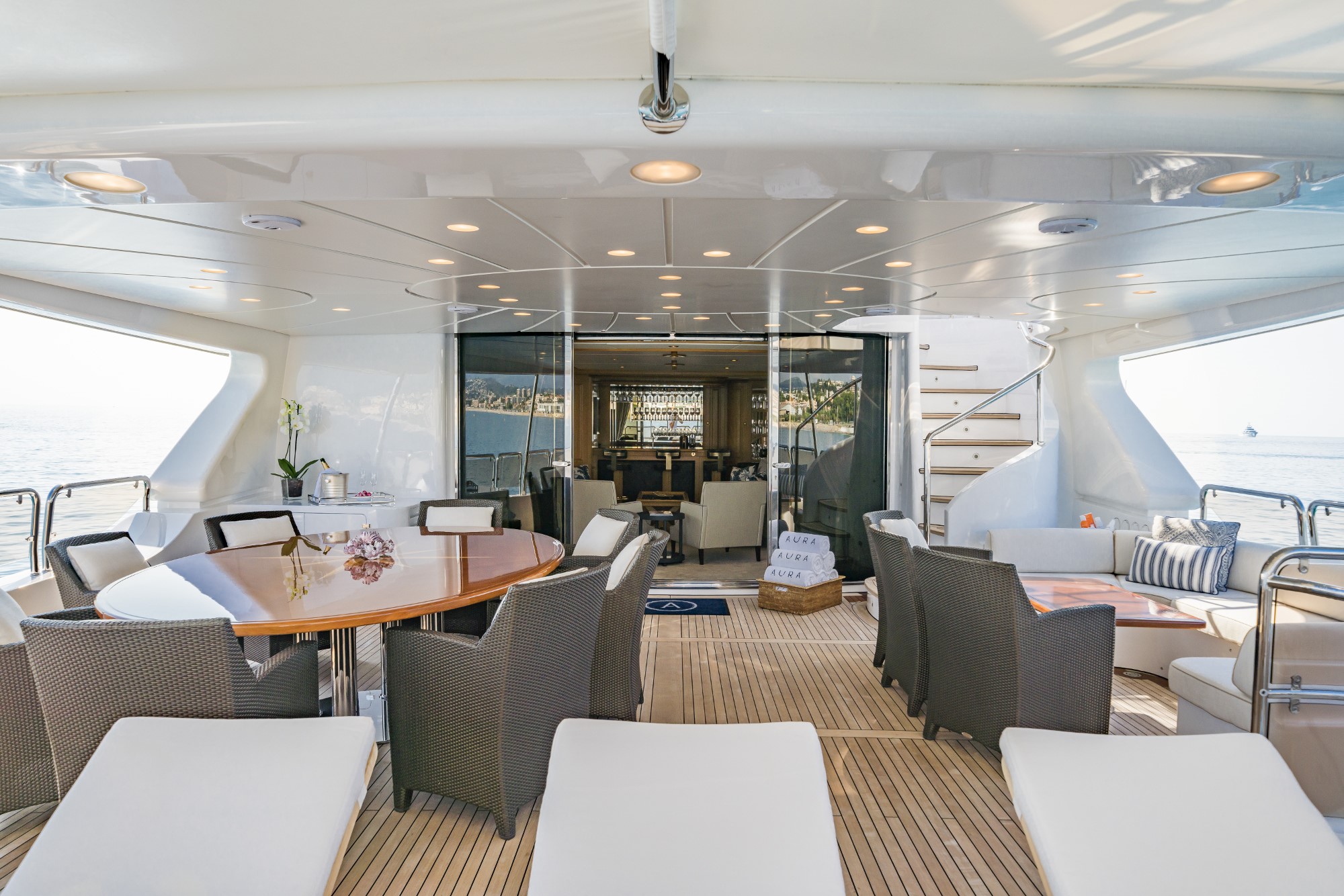 Above the main deck, charter yacht AURA has a well-appointed sky lounge, which makes a fabulous social hub, ...