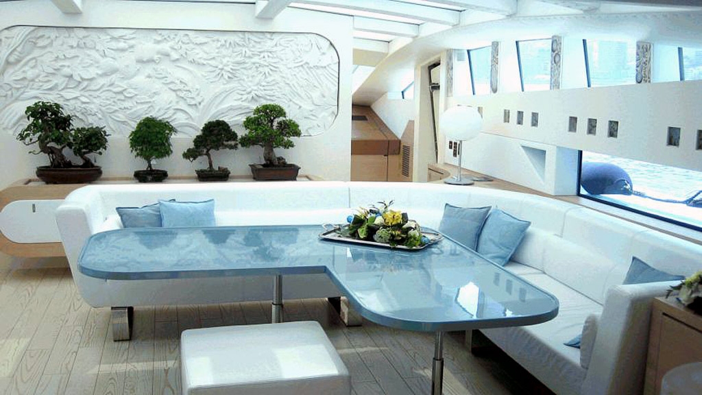 Motor yacht BLUE PRINCESS STAR boasts a generous salon with a modern vibe and elegant ambiance. Ample natural light flows through elongated side windows and overhead sky lights, enhancing the refined tone of the subtle cream furnishings and panels.