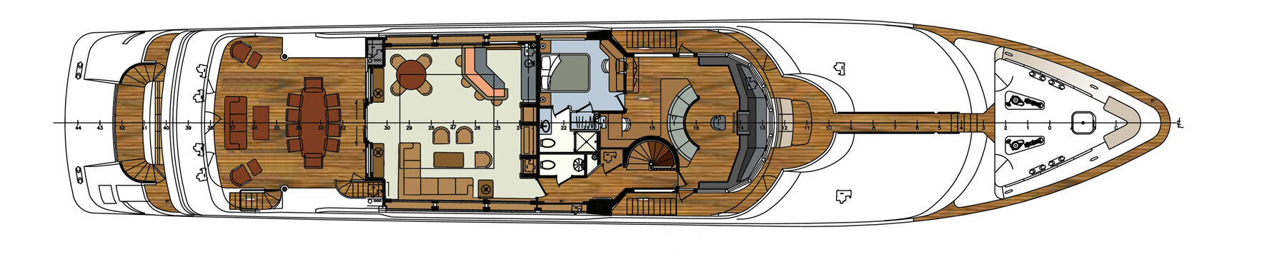This Superyacht has a semi-displacement aluminium hull, powered by 2 Caterpillar 3512 B diesel with 2,250 hp each, she cruises comfortably at 10 knots and reaches maximum speeds of 22 knots.