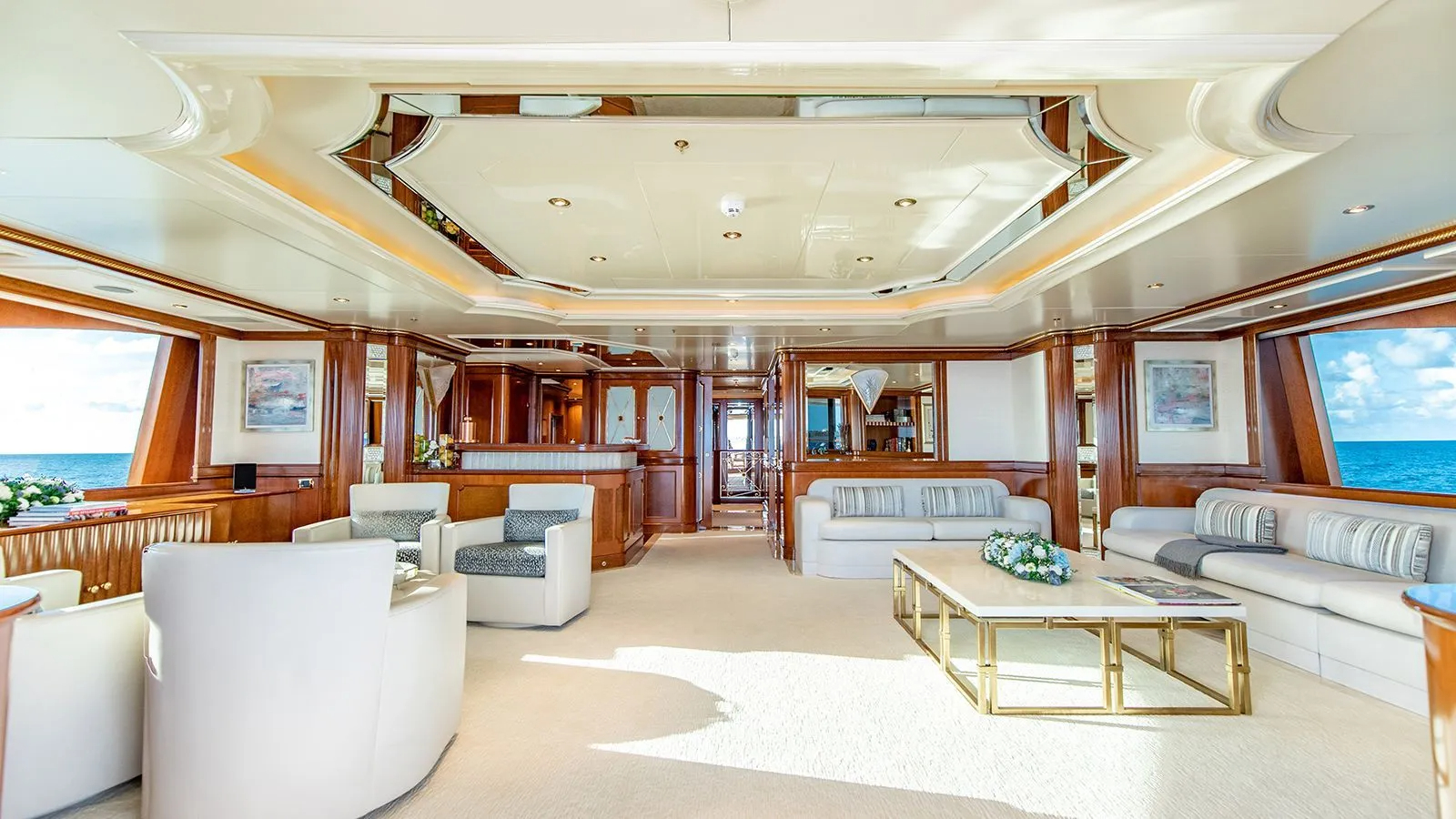 On the main deck, the principal superb entertaining areas include the main saloon, the dining saloon which seats 12 and the bar area.
