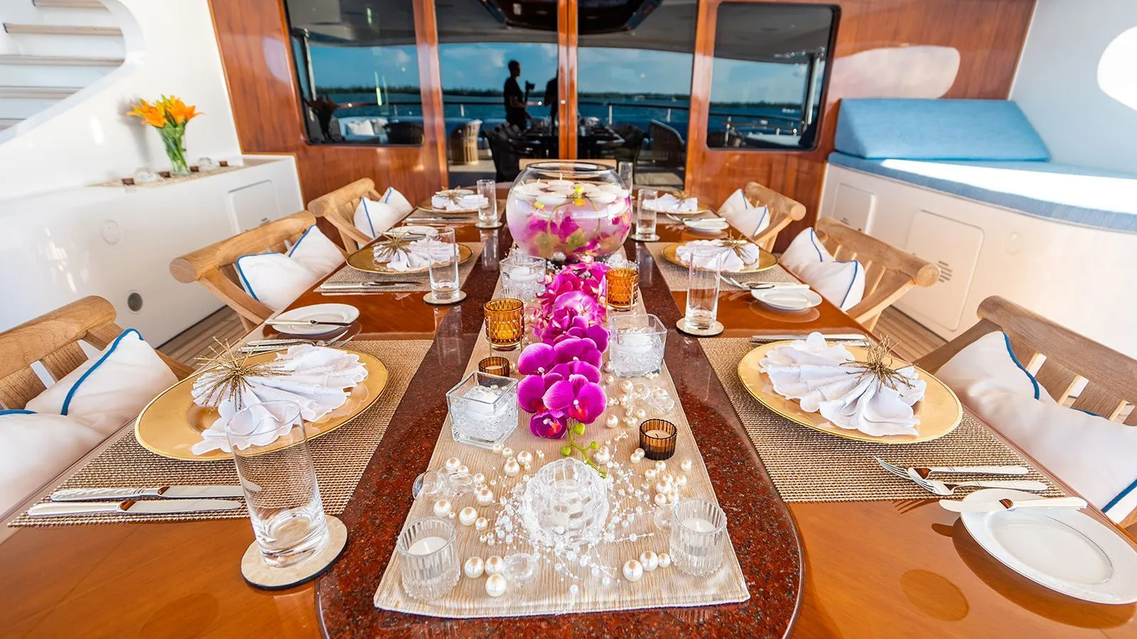 On the main deck, the principal superb entertaining areas include the main saloon, the dining saloon which seats 12 and the bar area.