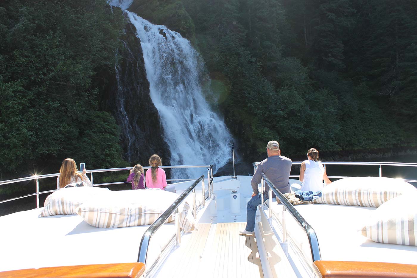 Motor yacht NICOLE EVELYN’s top deck is a sun lovers paradise, complete with chaise lounges, optional shade, a wet bar with seating and full entertainment systems.