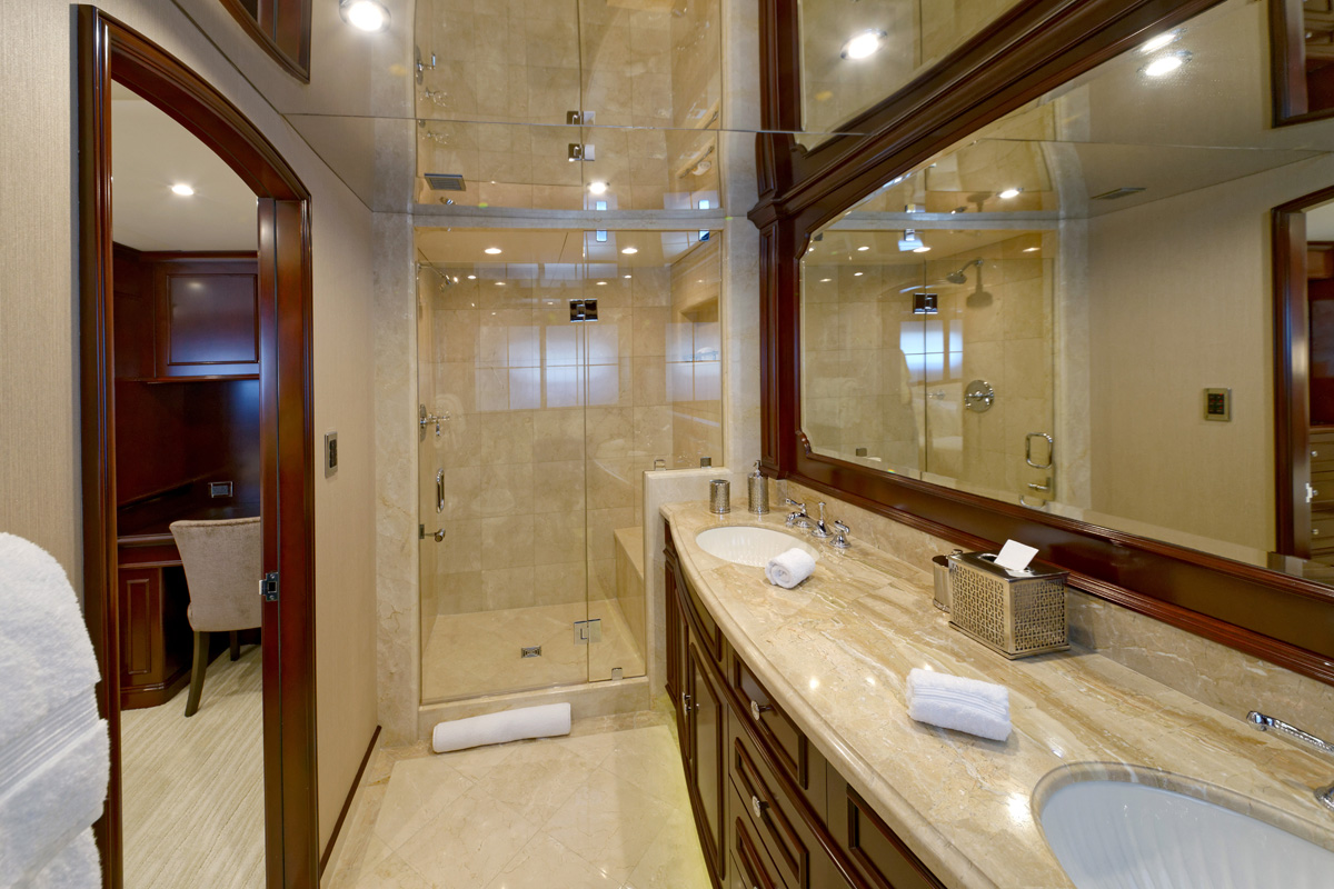 The main salon offers 2 opposing sofas, occasional chairs, a coffee table and full entertainment systems, perfect for entertaining and socializing. Forward and separate is the formal dining table, flanked in high-back chairs, offering a sophisticated atmosphere.
