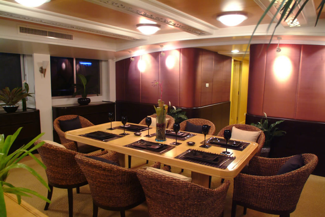 The Asia-based Motor Yacht MEDITATION is equipped with a formal and informal dining areas, a deck Spa Pool, indoor/outdoor theatre, computer lighting, high-end speakers, video on demand, Internet, and gym.