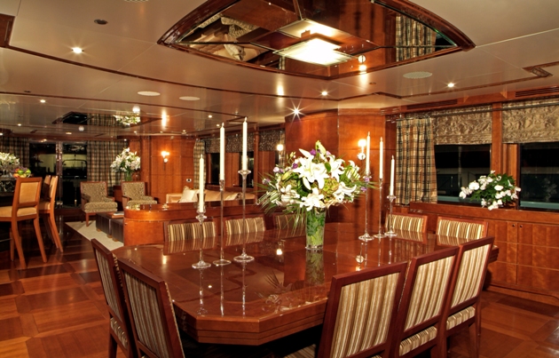 There is also a full bar with seating for 4 people and formal dining for 10 people adjacent to the main salon. Forward starboard there is a day head.