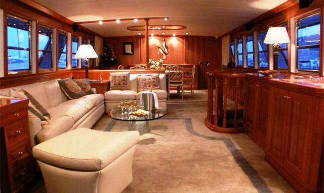 Going forward through double doors, you can enjoy the exquisite, newly refitted saloon in cherry wood, which was custom designed and built by Italian craftsmen. AVA’s saloon is ideally suited for relaxing and entertaining with a concealed large plasma screen TV, DVD, video, stereo, surround system and bar.