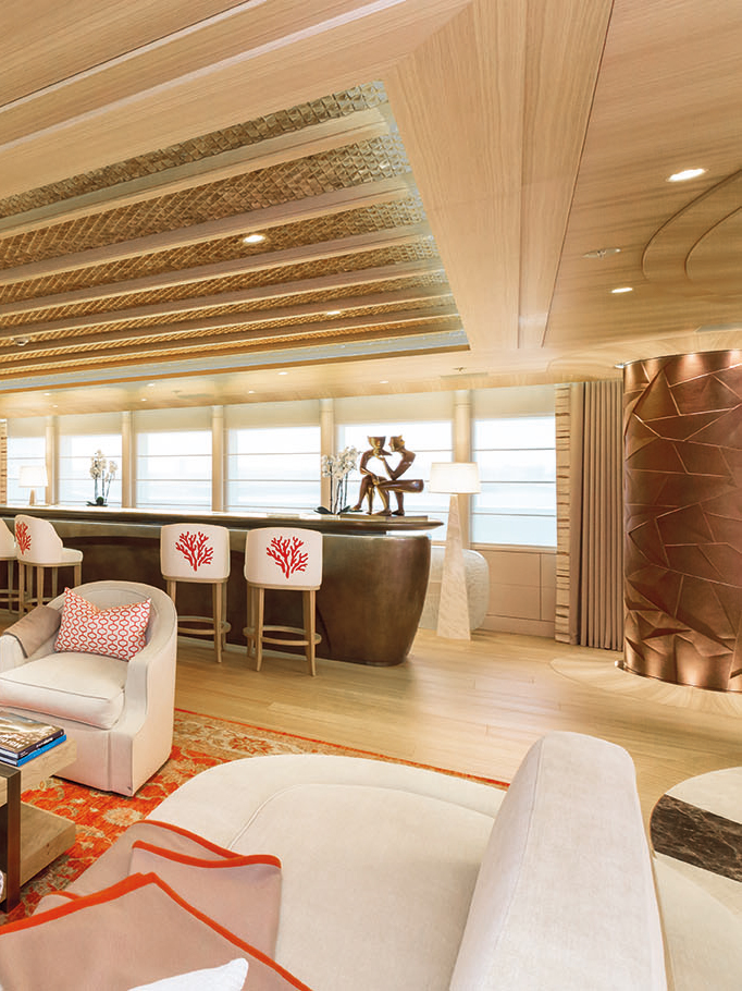 Owner's and VIP suites on the upper deck as well as two VIP and 3 guests' staterooms on the main deck ~ a beach club with fold down terraces featuring a wellness and spa center ~ a huge infinity pool with wet bar, a luxurious theatre ~ a grand piano.