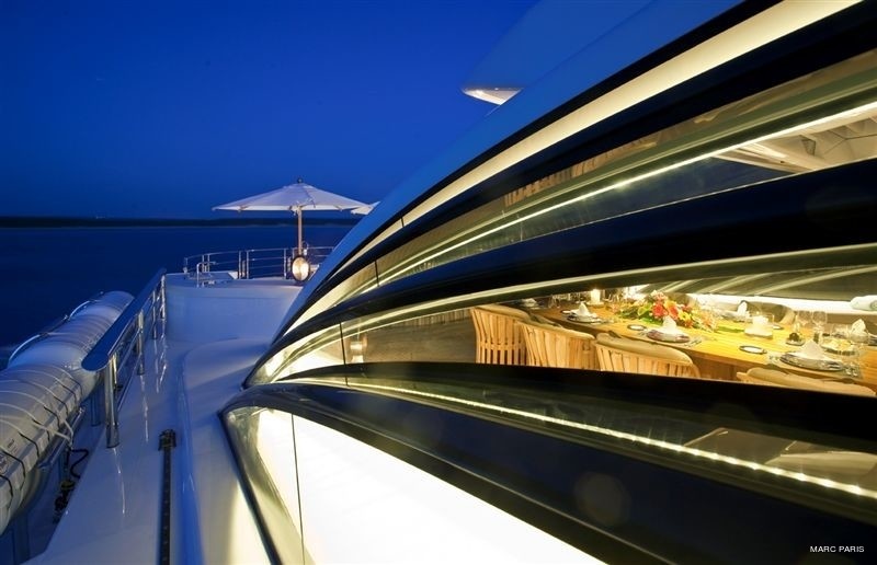 A centrally-located glass elevator makes for easy and elegant access to all parts of the yacht, including the 'wet feet' bar on the sun deck and the large Beach Club located at the stern.