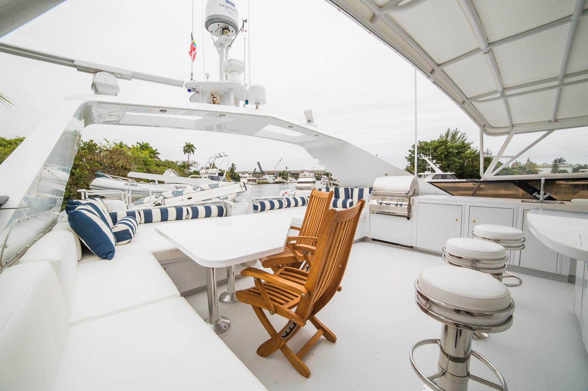 LADY LEX has plenty of exterior living areas to relax and enjoy, the aft deck is spacious and offers alfresco dining and wet bar, further aft the large swim platform makes water activities readily available.
