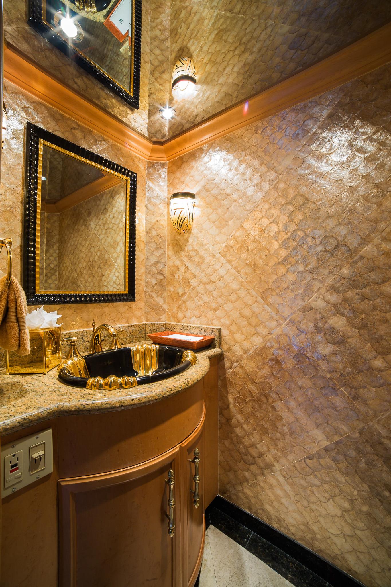The salon and dining are an open plan, aft the salon offers a large sofa, occasional comfortable chairs, two coffee tables and a games/cocktail table; forward the formal dining space is adorned with a lovely dark wood table and high back seating.