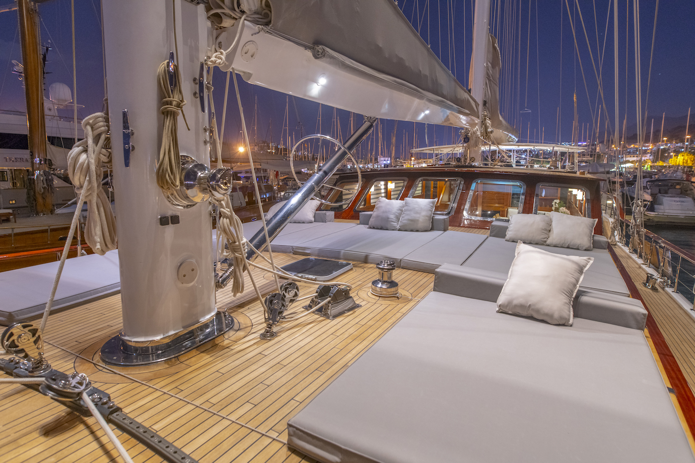 With a beam of 8m, this Turkish Gulet has vast areas of open deck space for sunbathing and lounging. Cushions are also provided. She has a delightful Spa Pool on deck and also easy access to the sea by a port side passer.
