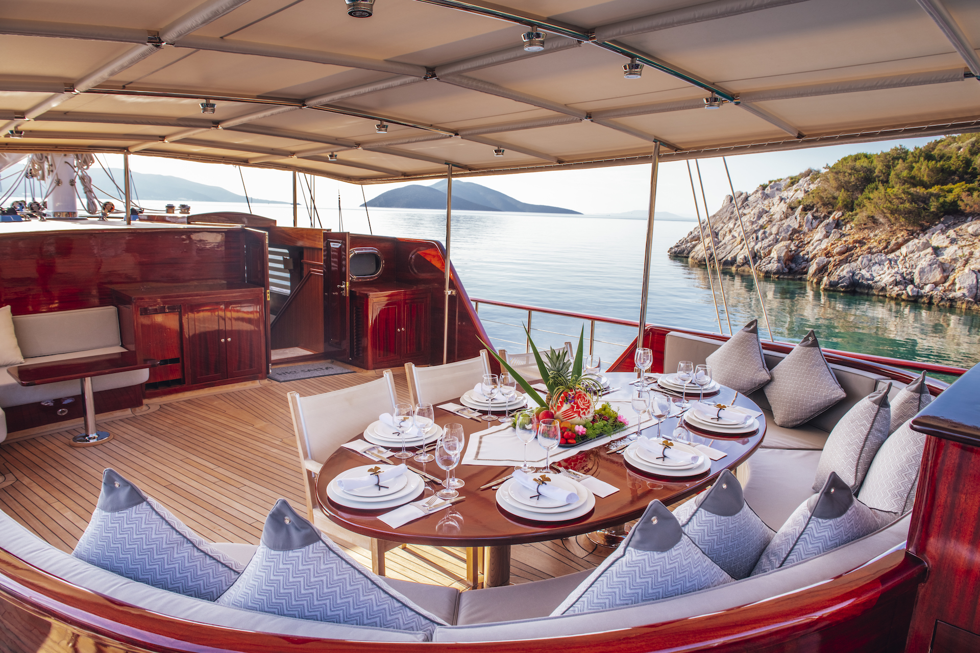 All of her cabins and salon are beautifully appointed with rich-panelled mahogany joinery and doors, and each is served by individually controlled air conditioning and heating.