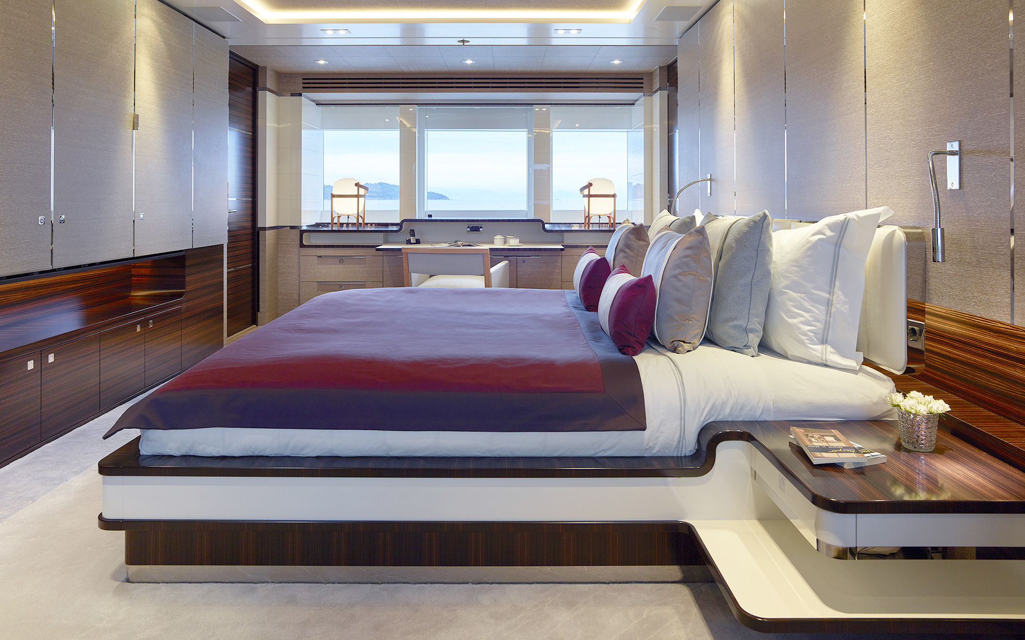 Forward on the same deck we have the owner’s stateroom with a huge en suite bathroom and a bath.