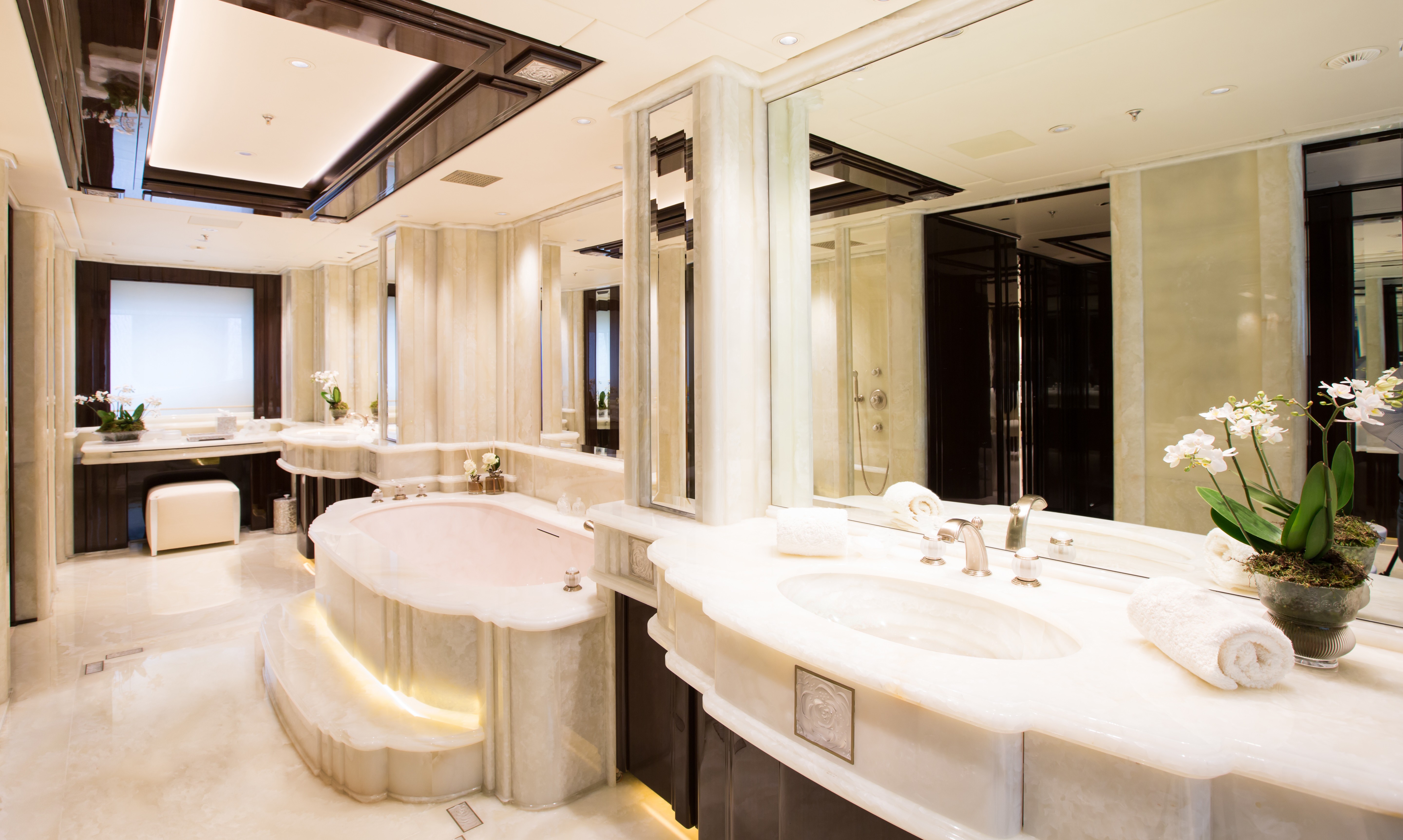 The sundeck is the perfect set up for at-sea area housing a large Jacuzzi surrounded by loungers, sun pads, a bar and barbecue.