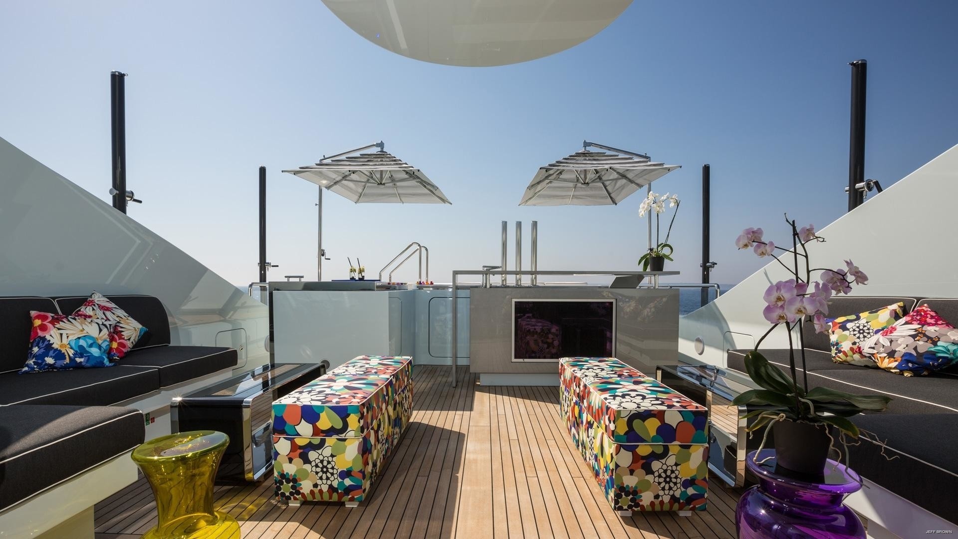 NOTABLE FEATURES OF 55M CUSTOM: huge decks to relax and entertain ~ beautiful saloon with elegant dining table and large sofa ~ sun deck with ...