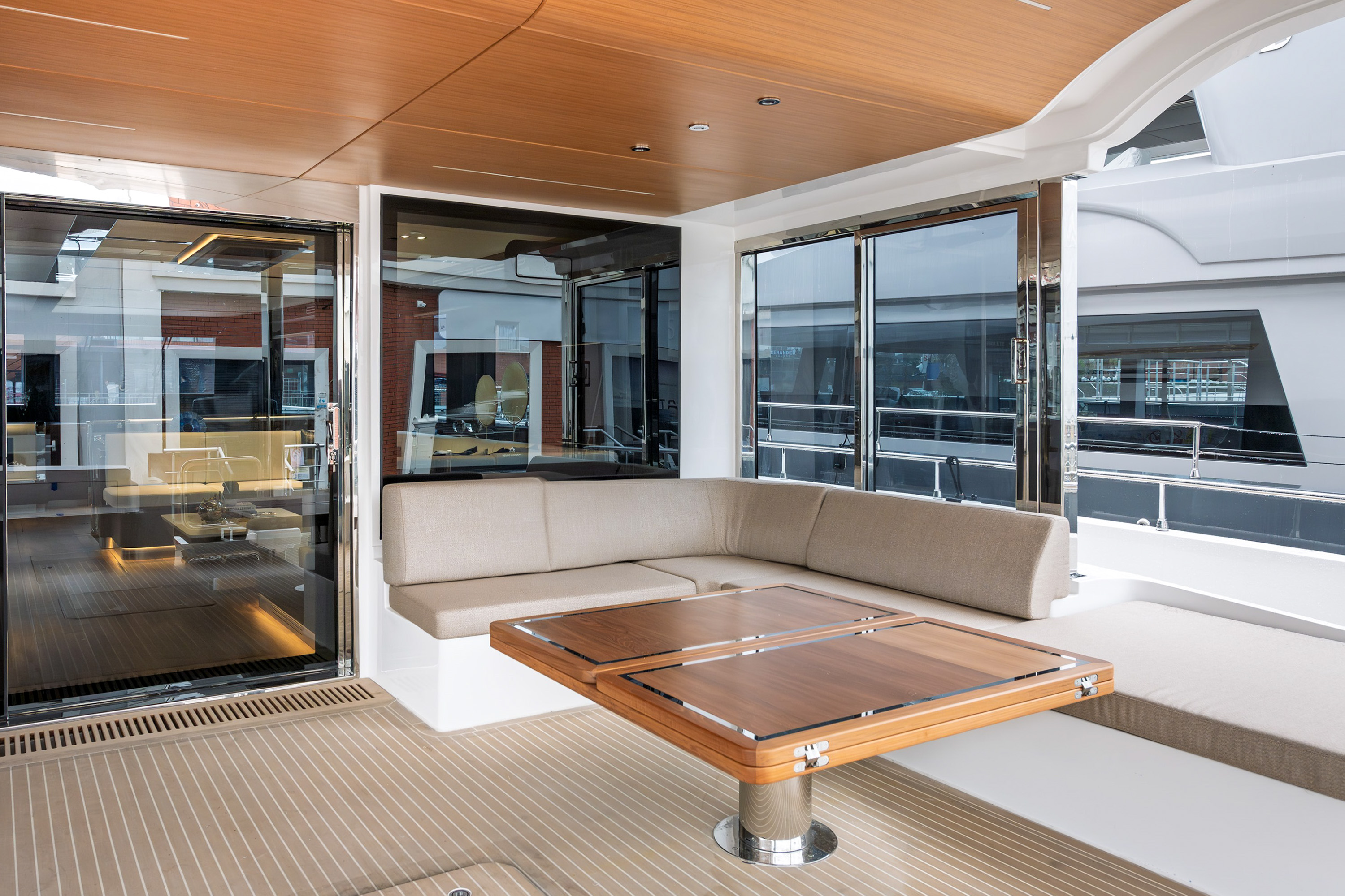 NOTABLE FEATURES OF 55M CUSTOM: huge decks to relax and entertain ~ beautiful saloon with elegant dining table and large sofa ~ sun deck with ...