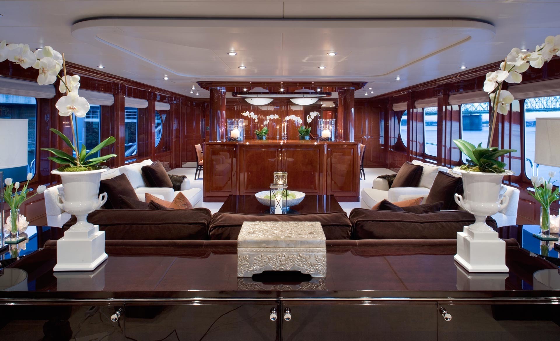 The main salon is spacious with plush seating and conversational area and a full entertainment center including a wide screen TV. NO COMMENT's dining area has a large table w/ seating for 12 guests.