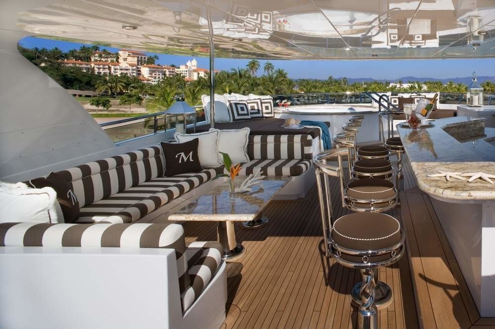 Spa Pool forward and large cushioned sun pad. Elevator service to all decks, BBQ grill, bar w/stools and adjacent banquette for casual dining for 12. Spacious aft deck carries water sports equipment.