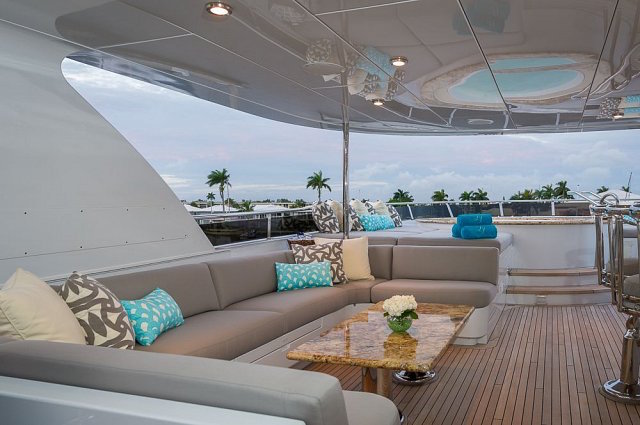 Main Deck Aff offers a dining table for 12 and a wet bar. Stairway to the bridge deck and easy access to the swim platform.