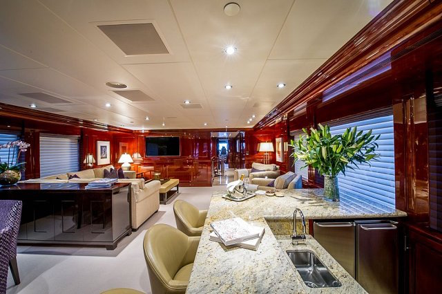 The main salon is spacious with plush seating and conversational area and a full entertainment center including a wide screen TV. NO COMMENT's dining area has a large table w/ seating for 12 guests.