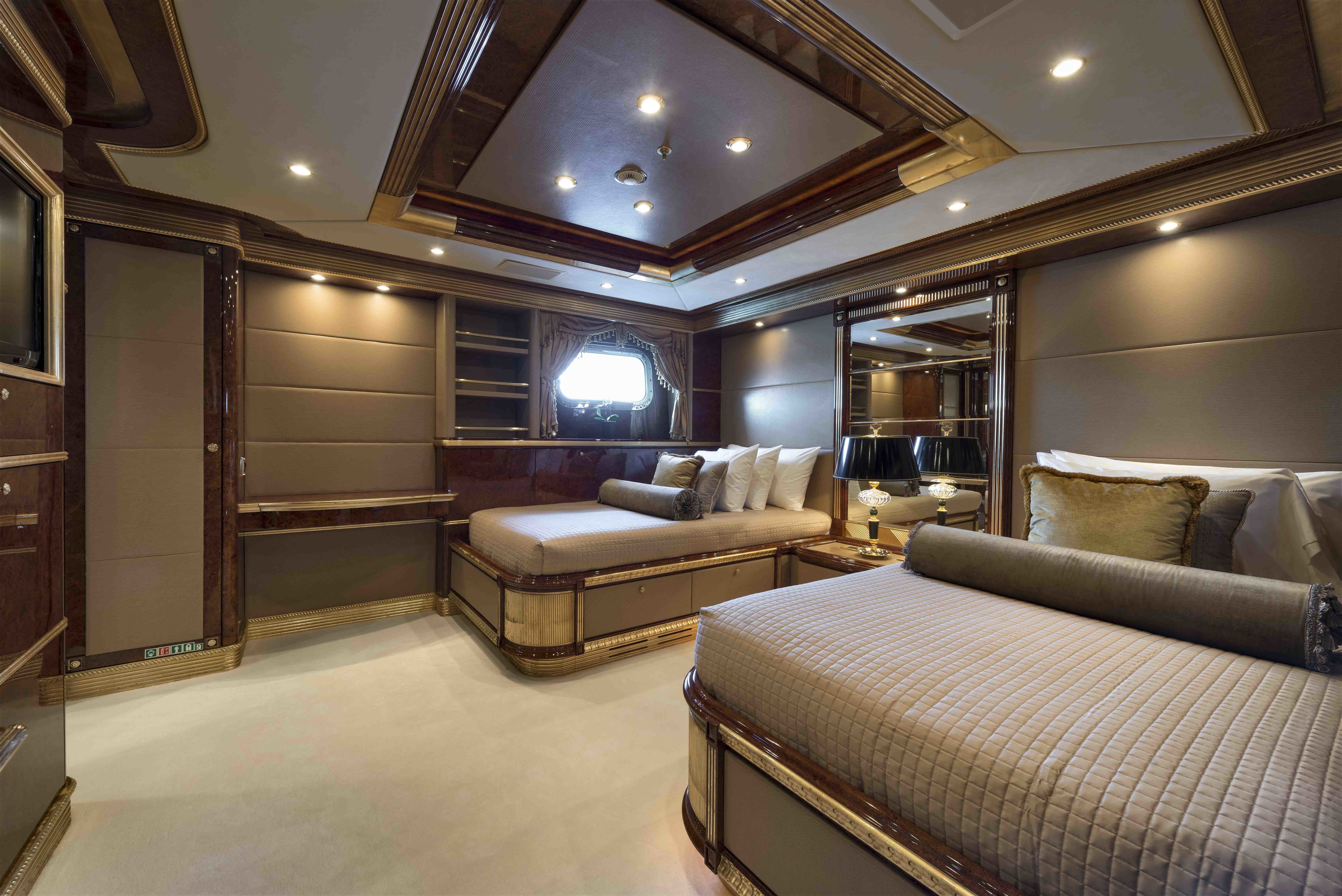 Below, on the upper deck is the home to the VIP suite forward, as well as the large sky lounge with its own bar, stools, numerous seating option, a large TV as well as a piano for pleasant evenings to relax. The exterior aft area offers two built-in sofas as well as a huge oval table to dine outside.