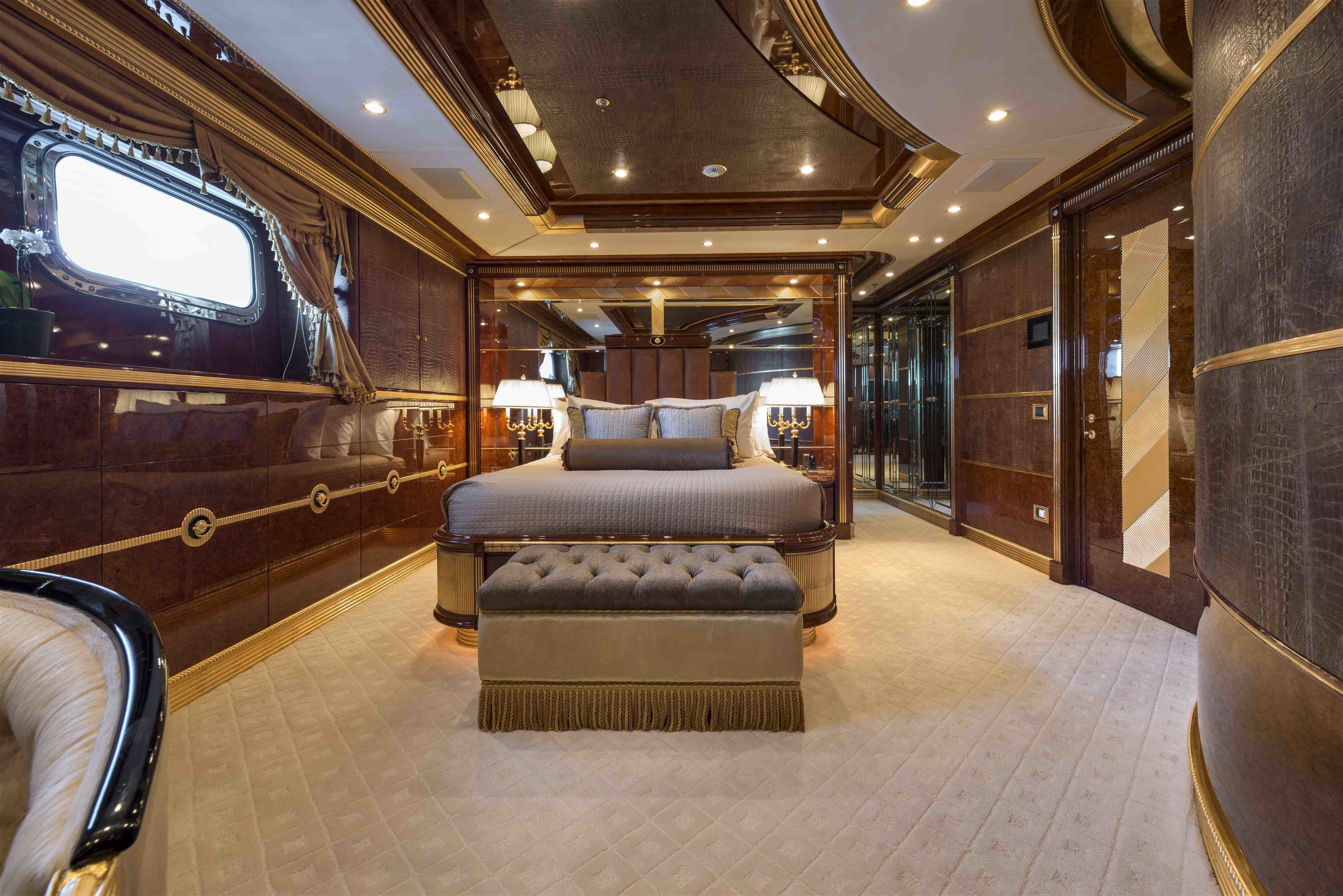 Below, on the upper deck is the home to the VIP suite forward, as well as the large sky lounge with its own bar, stools, numerous seating option, a large TV as well as a piano for pleasant evenings to relax. The exterior aft area offers two built-in sofas as well as a huge oval table to dine outside.