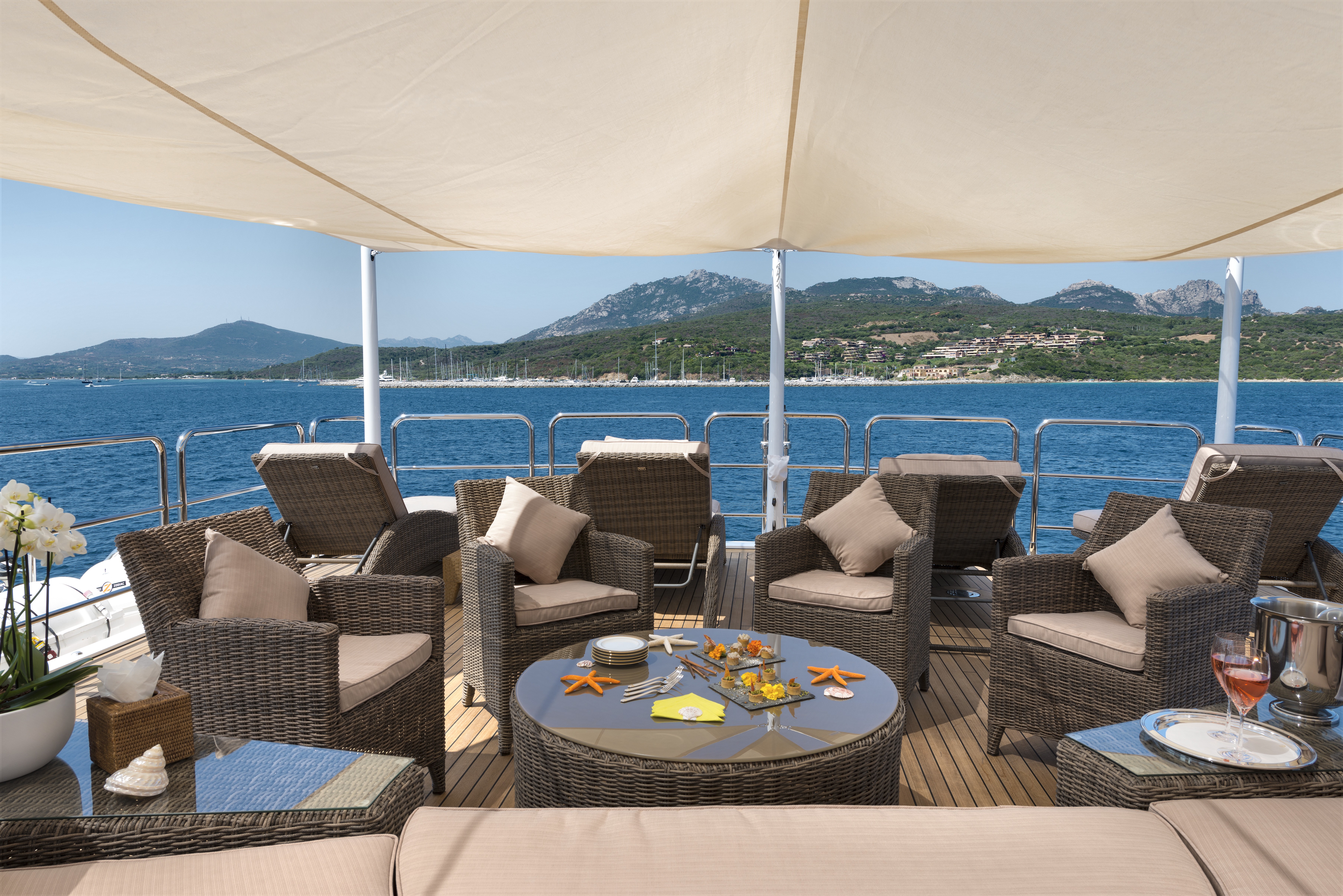 Aft, there is a large round dining table seating twelve, as well as sun loungers.