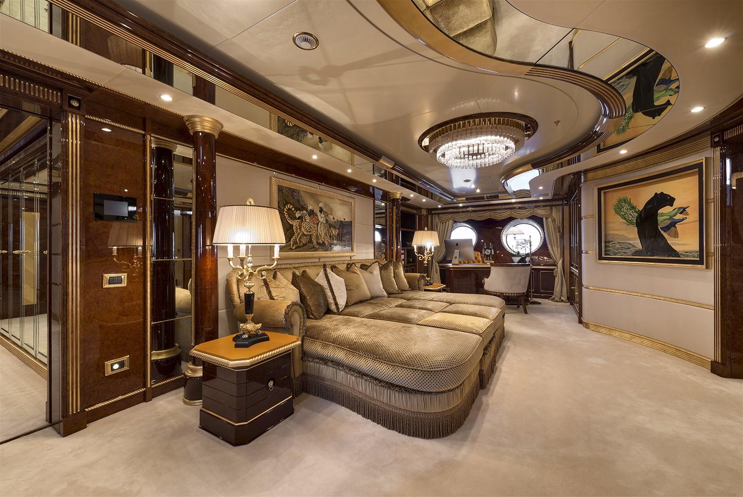 Below, on the upper deck is the home to the VIP suite forward, as well as the large sky lounge with its own bar, stools, numerous seating option, a large TV as well as a piano for pleasant evenings to relax. The exterior aft area offers two built-in sofas as well as a huge oval table to dine outside.