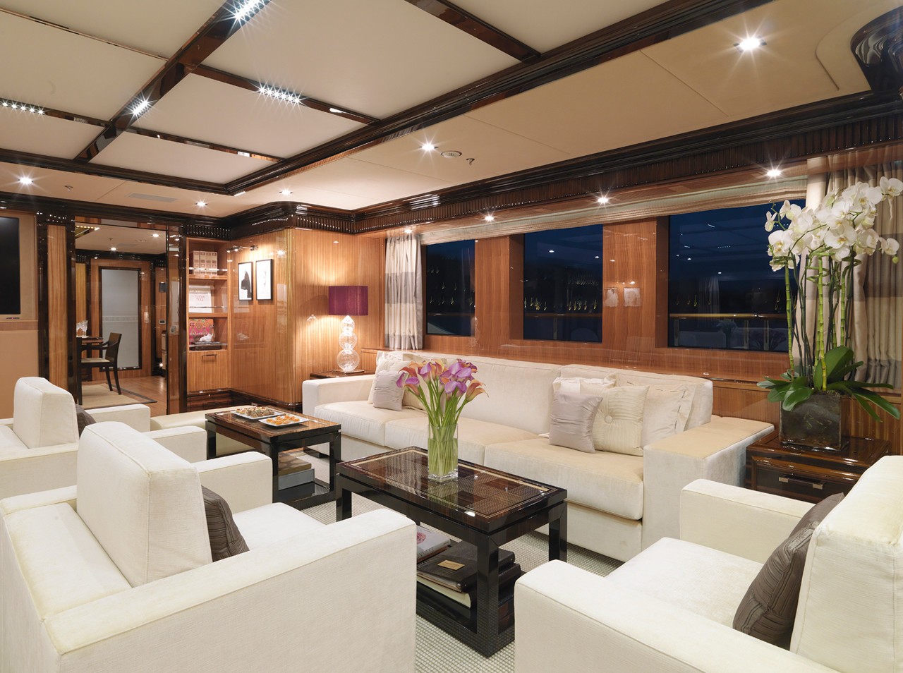 main deck saloon seating area with large couches at nightPhoto credit Benetti YachtsAbout 59m Custom Superyacht ...