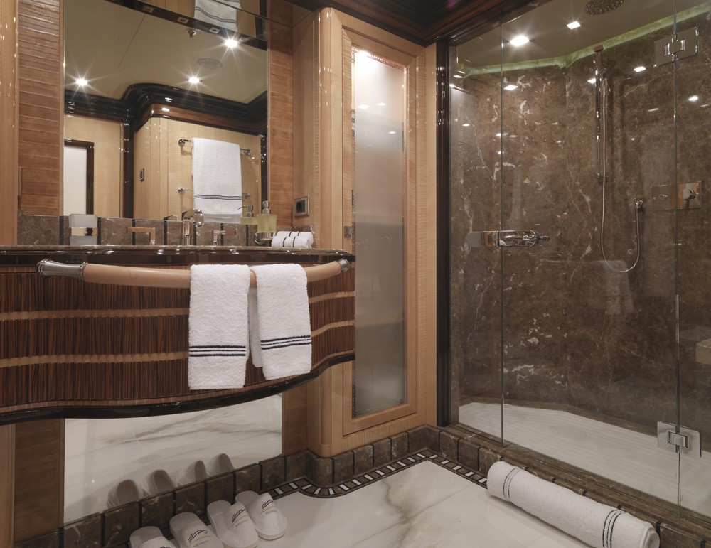 The bathroom in the master cabin is mainly in marble and has a shower, bath tub along with his and her sinks. The VIP cabin’s walls are inset with lacquered wood with soft to the touch salmon and eel skins. Twin cabins are on starboard and port side. In the Pullmans, there are three beds.