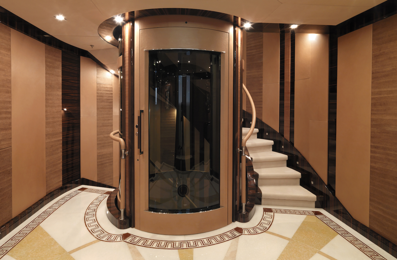 The main foyer has an inlay onyx marble floor. A circular glass lift accesses all floors on the yacht, with the shaft wrapped in leather with wood accents. In the main salon, which is light and airy, are two seating areas, a media centre and a bar.