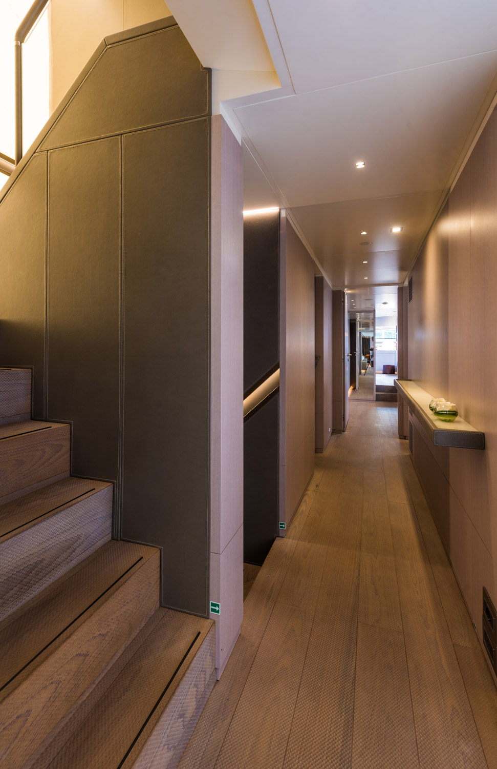 The foyer with stairs is amidships and leads to the lower levels. Walls that clad the lift are in backlit onyx creating a wonderful effect. Towards the bow is the owner’s cabin with full height windows offering excellent views.