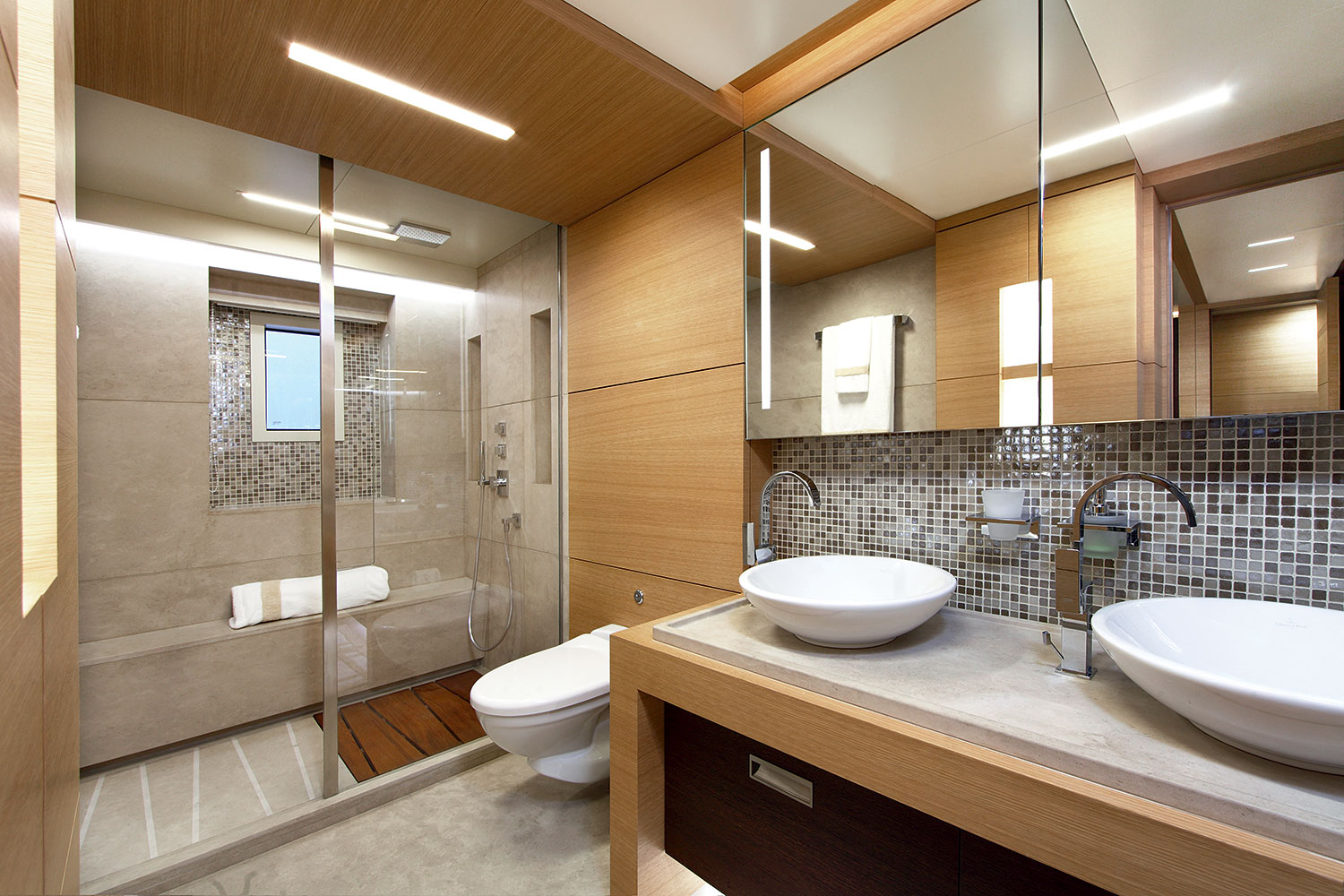 Inside, occupants of this room have their own walk-in wardrobe and a forward en-suite bathroom accessed via one of two doors. On the port side, the bulwark opens up to create a private sea terrace.