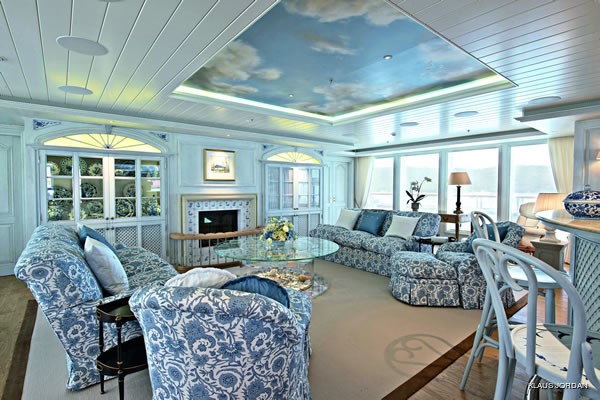 In the middle, there are two almost symmetrical seating areas on the port and starboard sides and there is a grand piano for live entertainment.